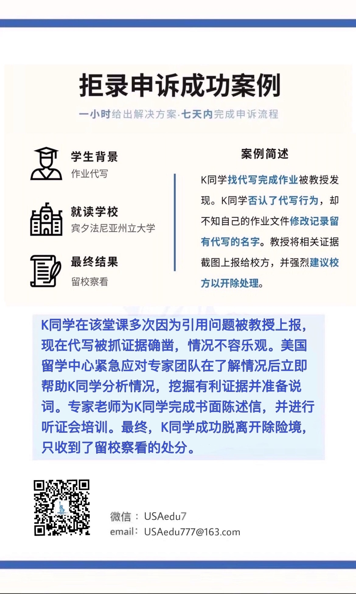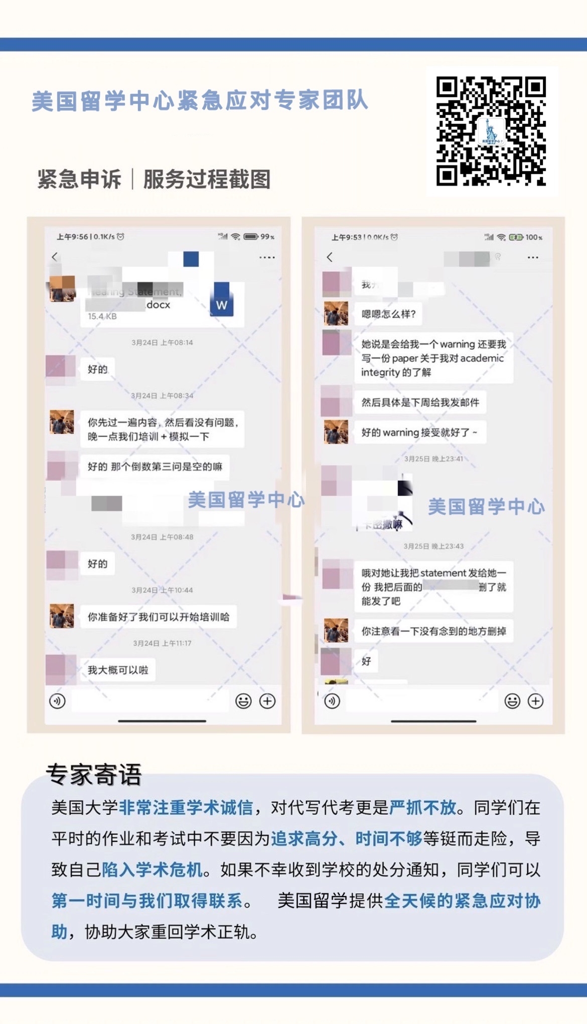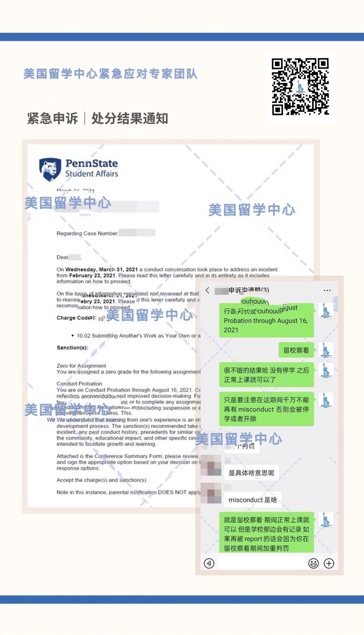 国际学生自己申诉,很少有效。一是因为语言障碍,二是因为不了解学校制度,最重要的是,学生在这种情况下已经处于非常不利的状态,自己申诉反而容易弄巧成拙。所以有第三方机构帮助,能够站在客观的角度去阐述事件详情,也因为多年的经验,申述成功机会成倍增加。点击了解如何写申诉信: