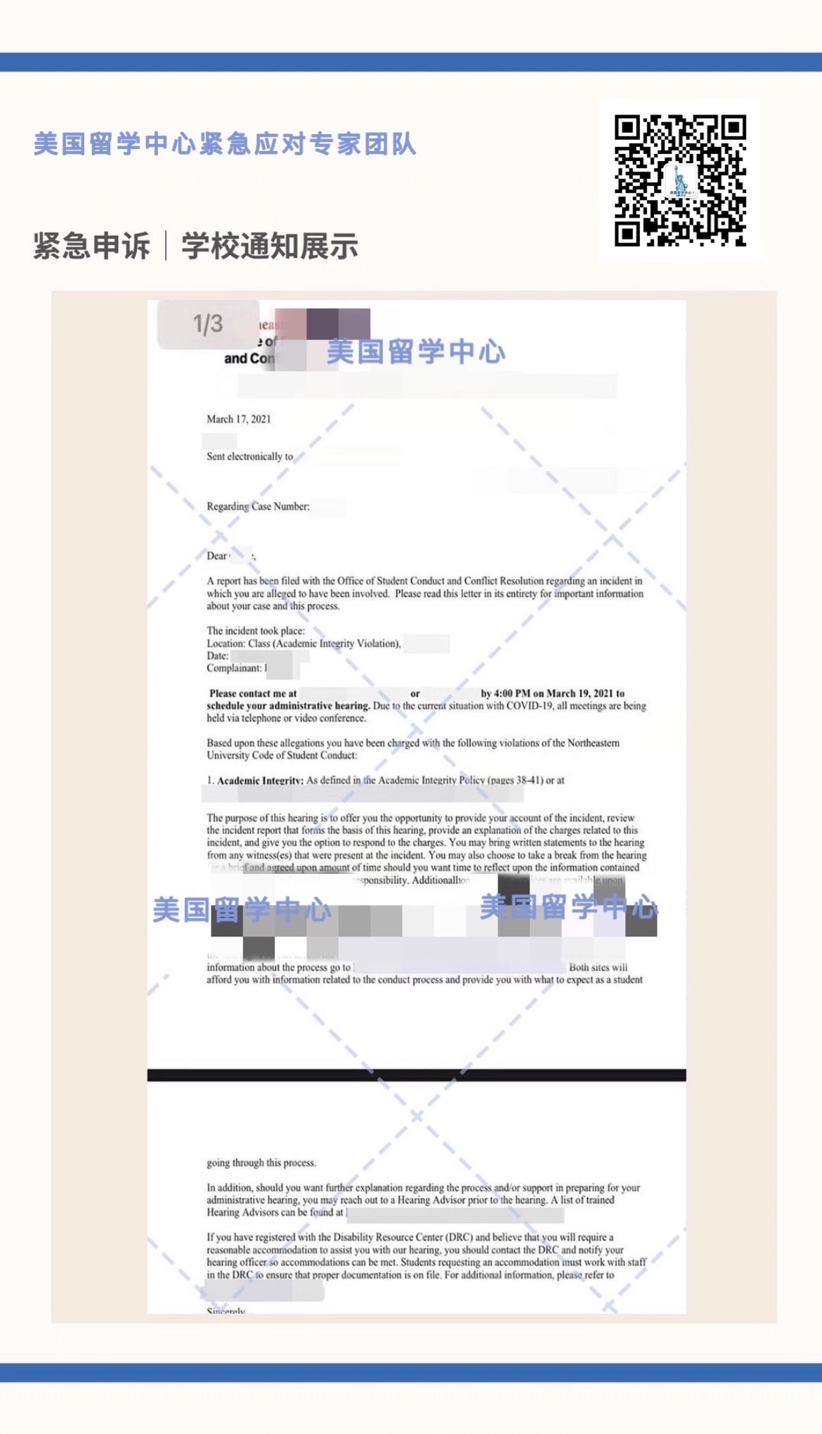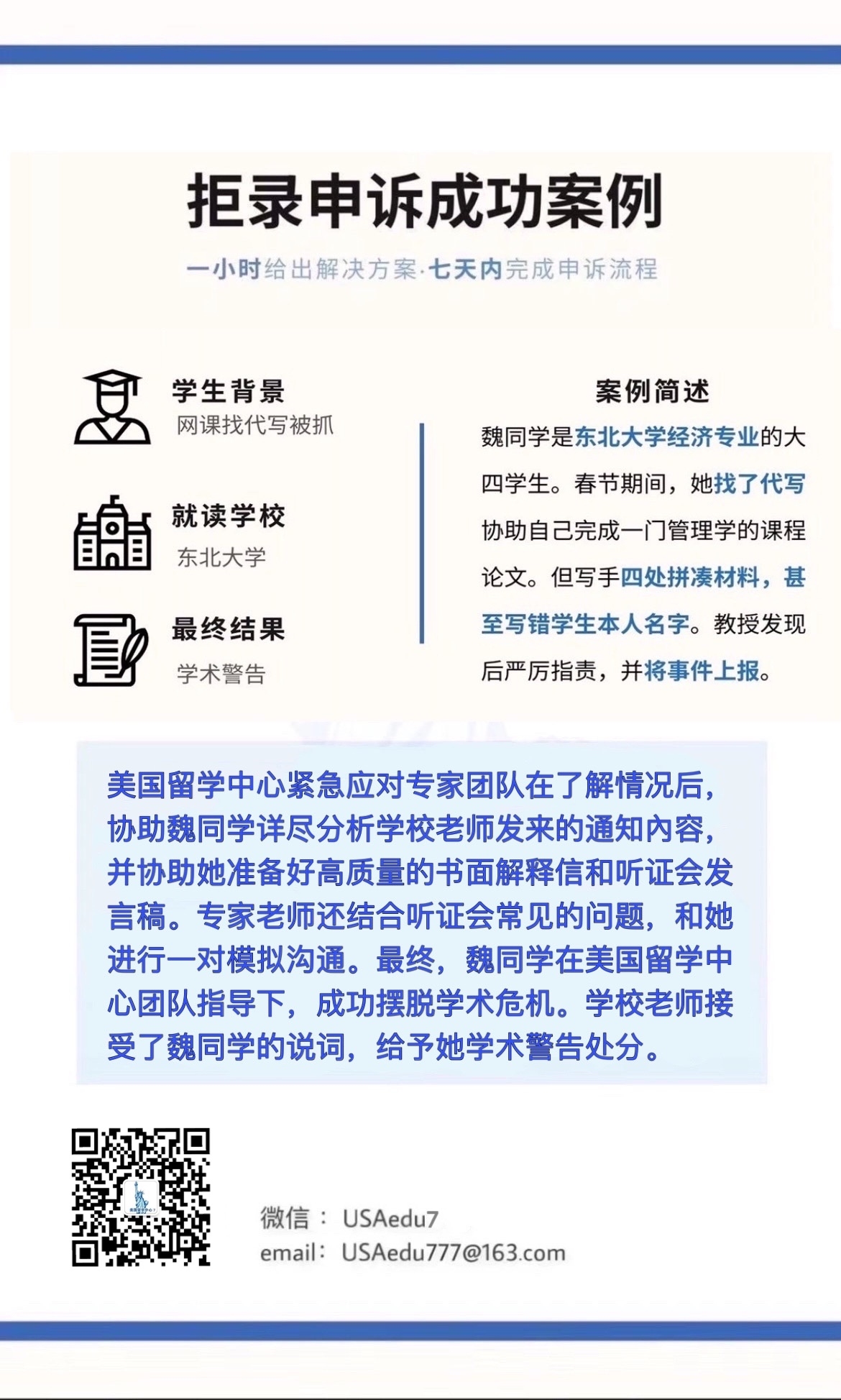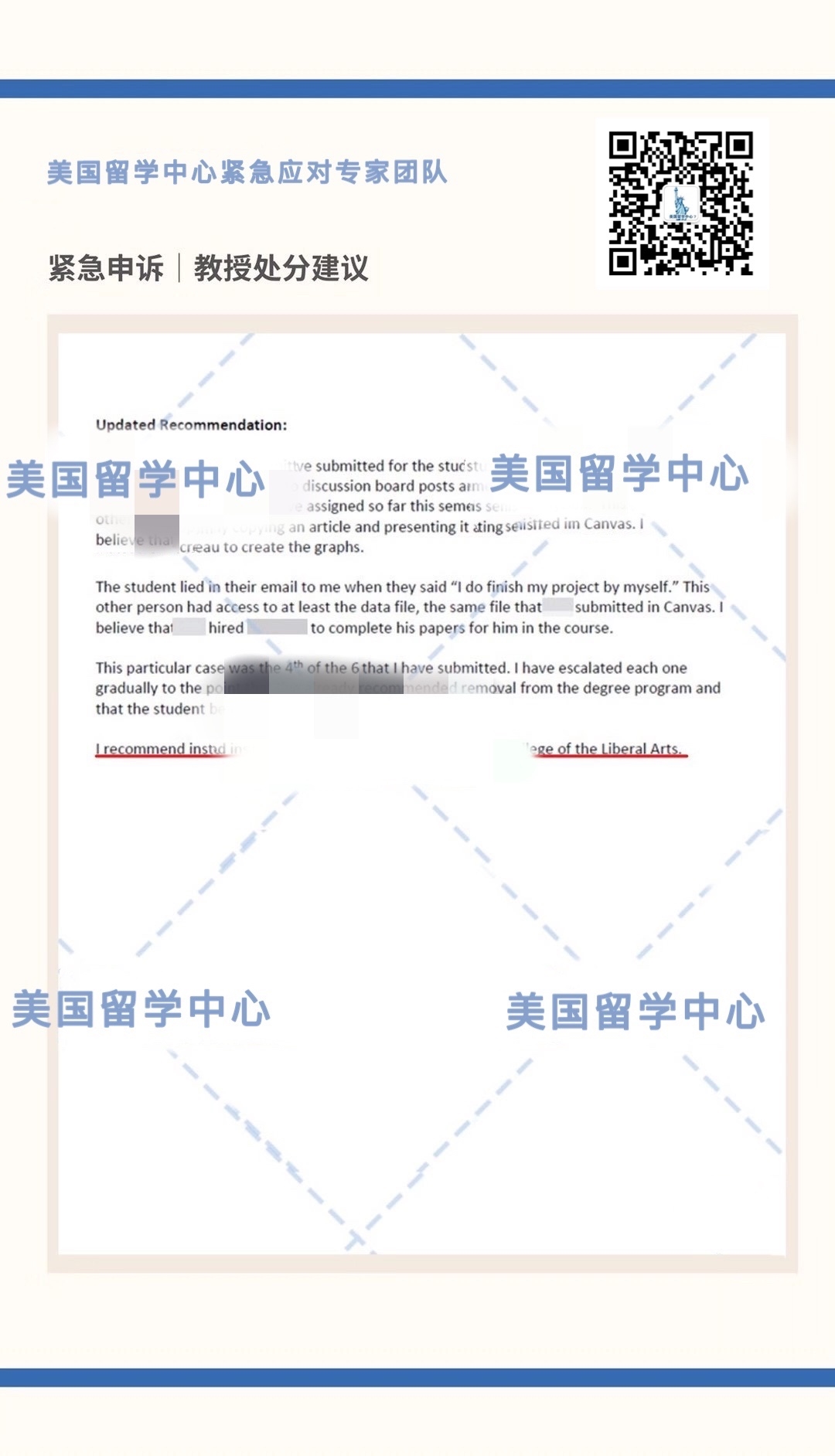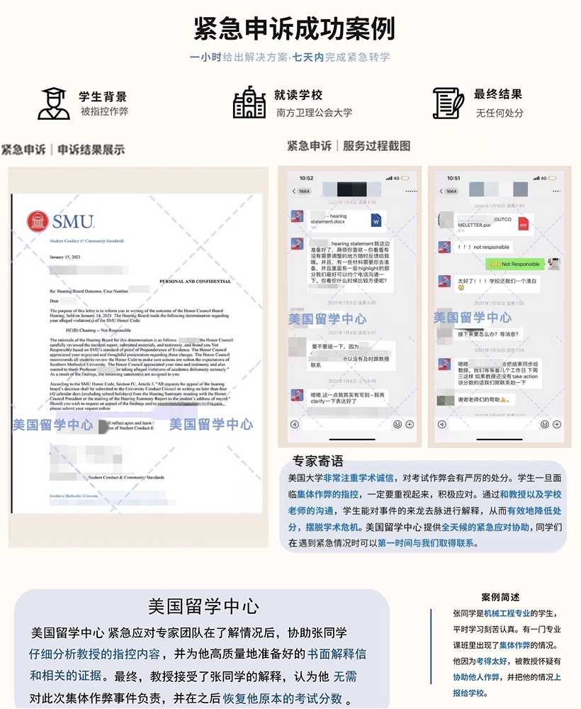国际学生自己申诉,很少有效。一是因为语言障碍,二是因为不了解学校制度,最重要的是,学生在这种情况下已经处于非常不利的状态,自己申诉反而容易弄巧成拙。所以有第三方机构帮助,能够站在客观的角度去阐述事件详情,也因为多年的经验,申述成功机会成倍增加。点击了解如何写申诉信: